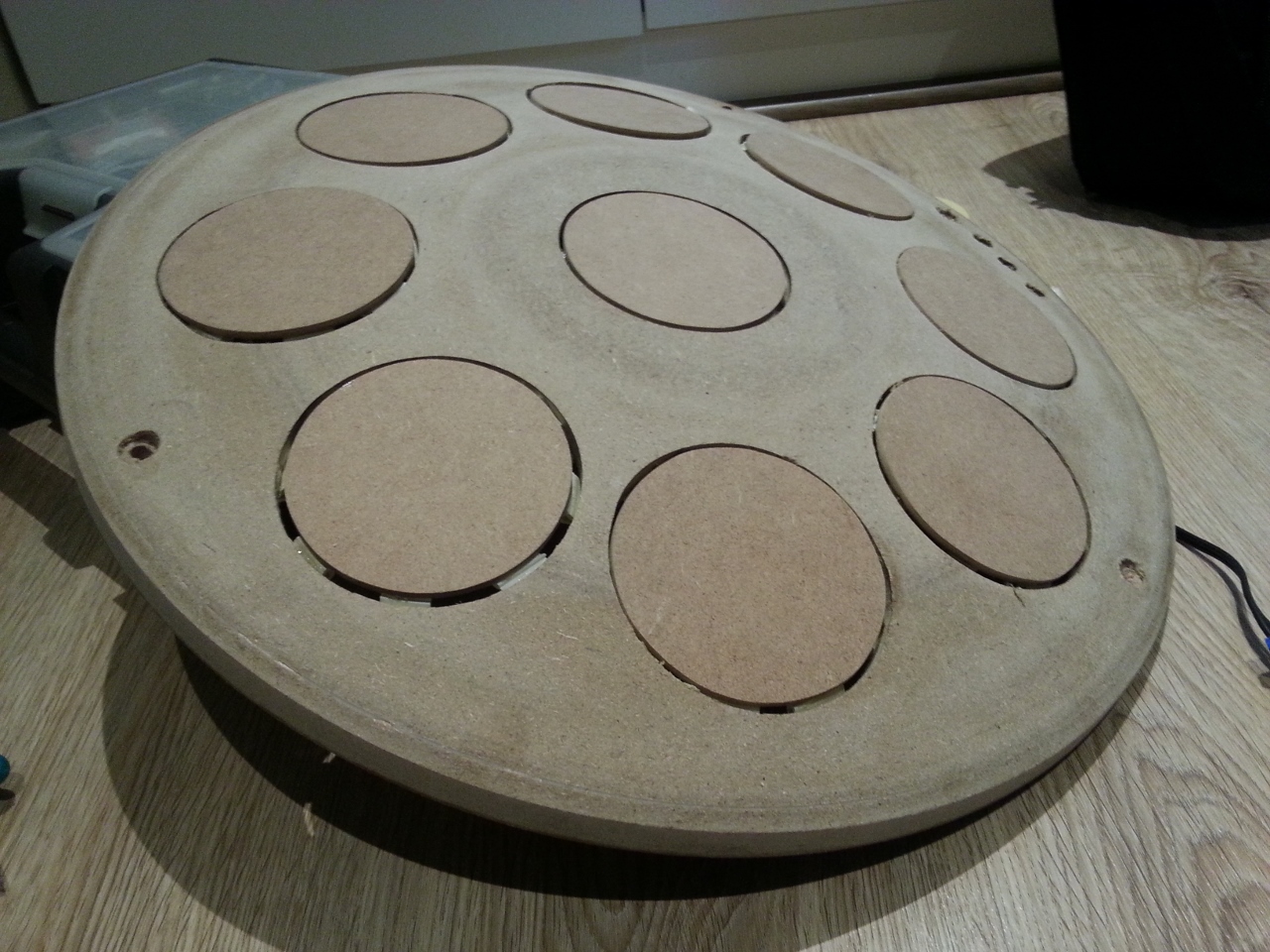 Wooden prototype is now fully functional after a number of sensor reworks. The sample device now includes two Halo tunings and two Original Hanpan* tunings, supplied by Soniccouture.